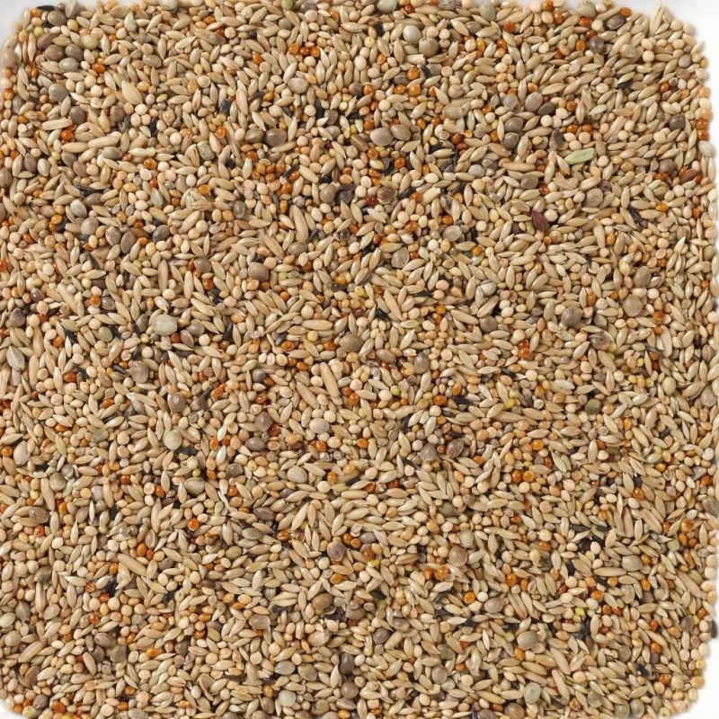 Alpistes 36%, millet jaune 15%, millet blanc 10%, panis jaune 10%, millet rouge 10%, millet japonais 8%, avoine pelée 5%, chanvre 4%, niger 2%