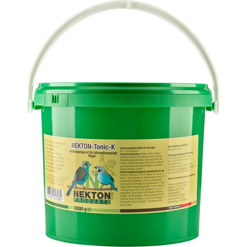 Les produits NEKTON-Tonic se distinguent tout particulièrement par le fait que les 60 substances qu‘ils contiennent apparaissent toutes sous une forme entièrement minéralisée, ce qui leur permet d‘être disponibles pour l‘organisme immédiatement après l‘administration, sans peser sur les organes digestifs. Aide l‘oiseau en cas de maladies, lors de l‘élevage des petits, et chez les animaux souffrant de malnutrition. NEKTON-Tonic peut également, en cas de besoin, être administré pendant un certain temps comme aliment unique.